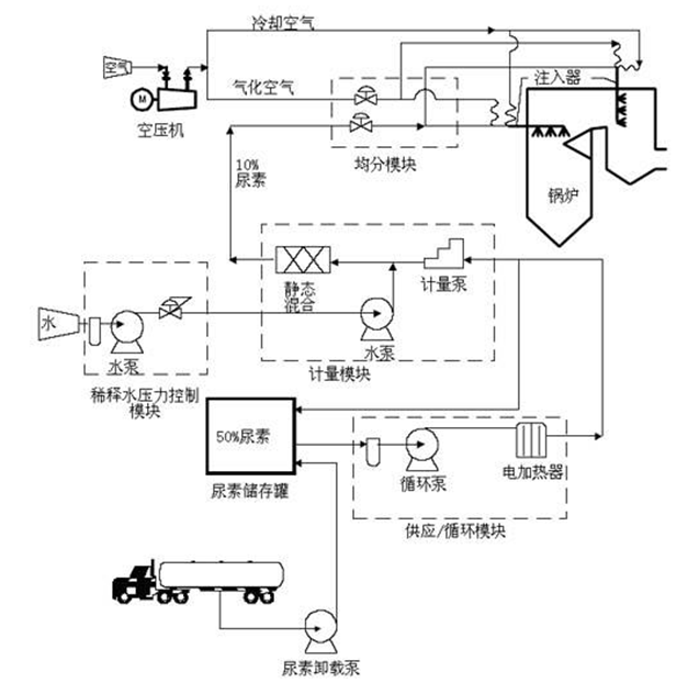 ? ? ? ?SNCR系統(tǒng)工藝流程示意。爐膛壁面上安裝有還原劑噴嘴,還原劑通過噴嘴噴入煙氣中,并與煙氣混合,反應(yīng)后的煙氣流出鍋爐。整個系統(tǒng)由還原劑貯槽、還原劑噴入裝置和控制儀表所構(gòu)成。氨是以氣態(tài)形式噴入爐膛,而尿素是以液態(tài)形式噴入,兩者在設(shè)計和巧行上均有差別。尿素相對氨而言,貯存更方便且能更好地在煙氣中分散,對于大型鍋爐,尿素SNCR應(yīng)用更普遍。當(dāng)氨與NOx反應(yīng)不完全時,未反應(yīng)完全的NH3將從SNCR系統(tǒng)逸出。反應(yīng)不完全的原因主要來自兩個方面:一種是因為反應(yīng)的溫度低,影響了氨與NOx的反應(yīng);另一種可能是噴入的還原劑與煙氣混合不均勻。因此,還原劑噴射系統(tǒng)必須將還原劑噴入到鍋爐內(nèi)有效的部位,以保證氨與NOx的混合均勻。
