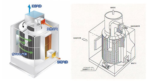 降低收集廢氣后通過主工藝風機的抽吸作用,經(jīng)過前處理干式過濾器進行過濾后進入轉(zhuǎn)輪,經(jīng)轉(zhuǎn)輪吸附達標后排放至煙囪;脫附氣經(jīng)CO風機進入CO爐,脫附濃縮后的廢氣在CO反應(yīng)裝置中被加熱至300℃以上,氧化成為CO2和H2O,氧化后的高溫氣體經(jīng)脫附換熱器做為給脫附氣體升溫用。