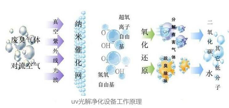 特制UV紫外線燈:利用特制的高能高臭氧UV紫外線光束照射廢氣,裂解工業(yè)廢氣如:氨、硫化氫、甲硫氫、甲硫醇、甲硫醚、乙酸丁酯、乙酸乙酯、二甲二硫、二硫化碳和苯乙烯,硫化物H2S、VOC類,苯、甲苯、二甲苯的分子鏈結(jié)構(gòu),使有機(jī)或無機(jī)高分子惡臭化合物分子鏈,在高能紫外線光束照射下,降解轉(zhuǎn)變成低分子化合物,如CO2、H2O等。利用高能高臭氧UV紫外線光束分解空氣中的氧分子產(chǎn)生游離氧,即活性氧,因游離氧所攜正負(fù)電子不平衡所以需與氧分子結(jié)合,進(jìn)而產(chǎn)生臭氧。 UV+O2→O-+O*(活性氧)O+O2→O3(臭氧),眾所周知臭氧對有機(jī)物具有極強(qiáng)的氧化作用,對工業(yè)廢氣及其它刺激性異味有效果。工業(yè)廢氣利用排風(fēng)設(shè)備輸入到本凈化設(shè)備后,凈化設(shè)備運(yùn)用高能UV紫外線光束及臭氧對工業(yè)廢氣進(jìn)行協(xié)同分解氧化反應(yīng),使工業(yè)廢氣物質(zhì)其降解轉(zhuǎn)化成低分子化合物、水和二氧化碳,再通過排風(fēng)管道排出室外。利用高能-C光束裂解工業(yè)廢氣中細(xì)菌的分子鍵,破壞細(xì)菌的核酸(DNA),再通過臭氧進(jìn)行氧化反應(yīng),達(dá)到凈化及殺滅細(xì)菌的目的。