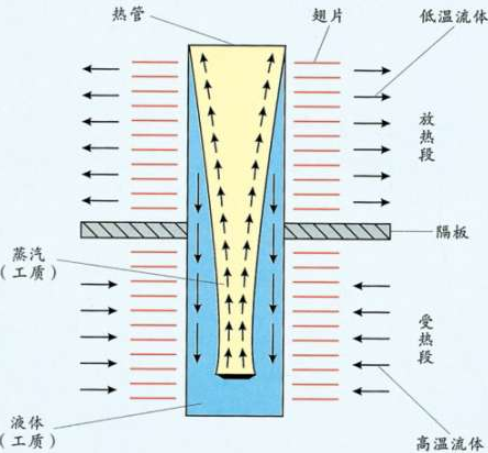 熱管工作原理:典型的重力熱管如圖所示,在密閉的管內(nèi)先抽成真空,在此狀態(tài)下充入適量工質(zhì),在熱管的下端加熱,工質(zhì)吸收熱量汽化為蒸汽,在微小的壓差下,上升到熱管上端,并向外界放出熱量,凝結(jié)為液體。冷凝液在重力的作用下,沿熱管內(nèi)壁返回到受熱段,并再次受熱汽化,如此循環(huán)往復(fù),連續(xù)不斷的將熱量由一端傳向另一端