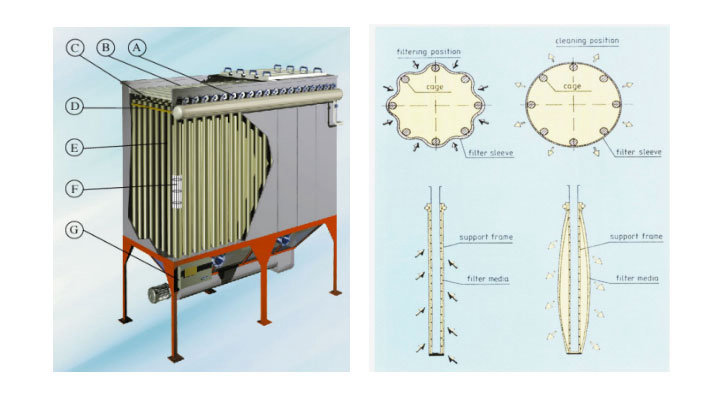 濾袋、籠骨和花板-----濾袋和籠骨組成了除塵器的濾灰系統(tǒng);花板用于支撐濾袋組件和分隔過(guò)濾室(含塵段)及凈氣室,并作為除塵器濾袋組件的檢修平臺(tái);濾袋組件從花板裝入
